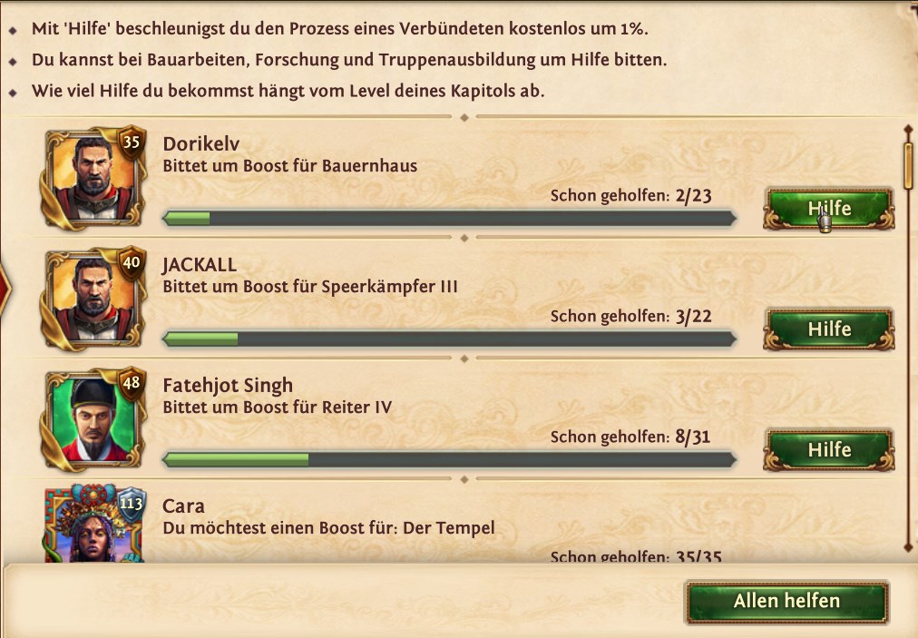 Hilfeklicks können mit dem Button „Allen helfen“ abgearbeitet werden. Die Entwickler bestrafen den Clan mit geringeren Hilfepunkten, wenn Alle helfen gedrückt wird. Einzelne Hilfe-Klicks sind aufwendiger, zeitintensiver und geben deutlich mehr Punkte als Allen helfen! Ein Test mit beiden Funktionen wurde November 2024 durchgeführt und zeigte enorme Unterschiede in den Punkten.
