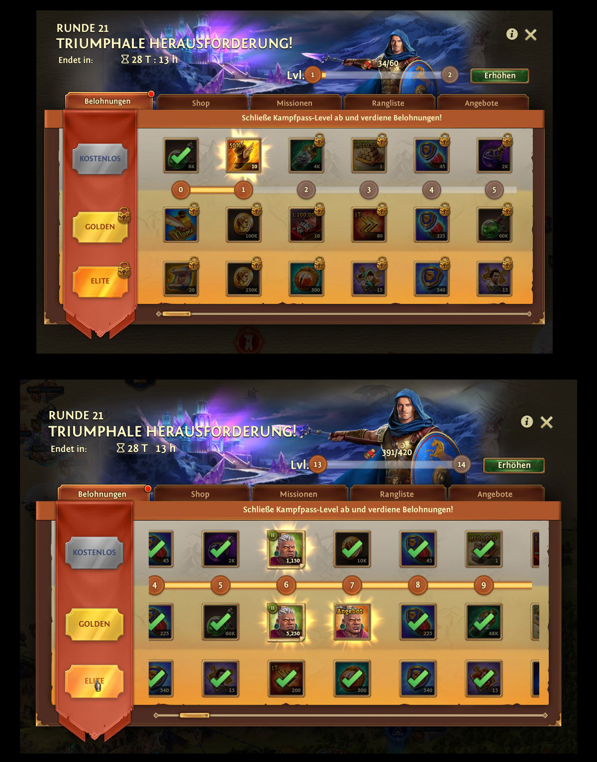 Es gibt den kostenlosen Pass, welcher allerdings nicht die Belohnungen im Union des Triumphs freischaltet. Mit dem goldenen Pass erhält man die Belohnungen in der Triumphalen Herausforderung und die Belohnungen im Union des Triumphs. Das ist ein unschlagbares Preis-Leistungspaket. Mit dem Elite-Pass erhält man zusätzliche Belohnungen, wie 400k Gold, 120 Millionen Bauressourcen und vieles mehr. Ab dem Gold-Pass bekommt der Spieler zusätzlich jeden Tag eine Belohnung.