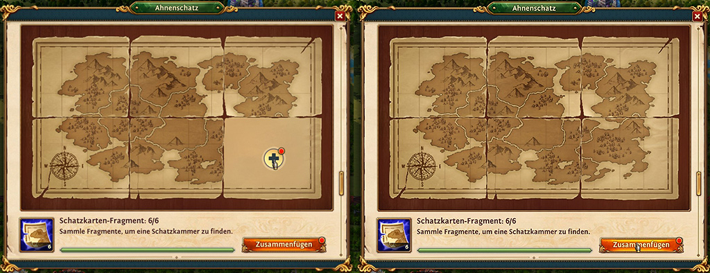 ist man auch im Besitz der sechs Schatzkarten-Fragmente. Diese können nun nach und nach freigelegt werden. Wenn das letzte Fragment freigelegt wurde, kann man nun auf ZUSAMMENFÜGEN drücken. Die einzelnen Fragmente werden zur Schatzkarte, diese führt zum Ahnenschatz, dem Ahnen-Turm.
