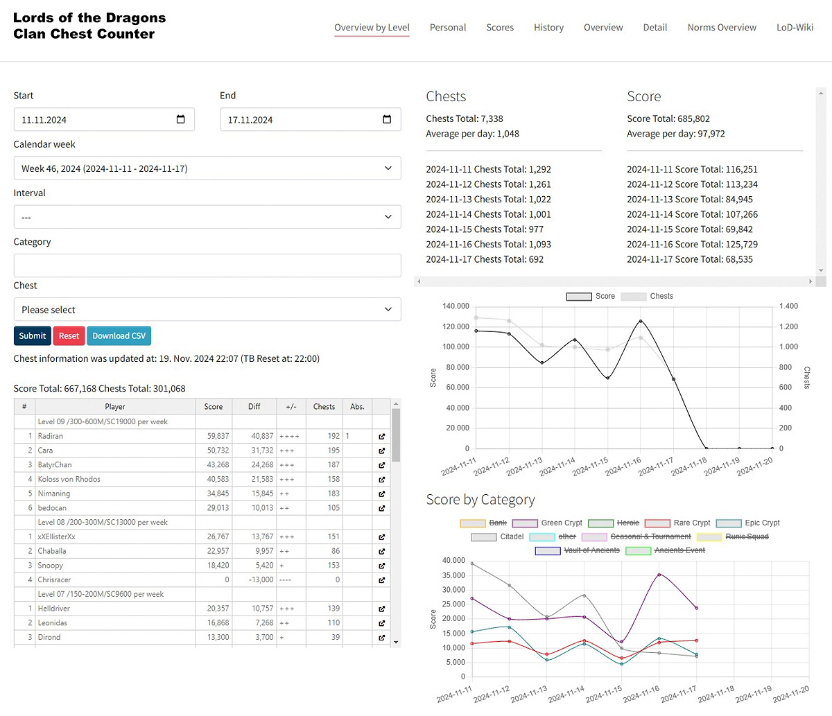 Die linke Ansichtsseite zeigt die gesamten Clantruhen pro Tag und die gesamte Punktzahl aller Spieler. Darunter können in Diagrammen weitere Statistiken angezeigt werden nach verschiedenen Kriterien wie grüne, seltene und epische Krypten und vieles mehr.