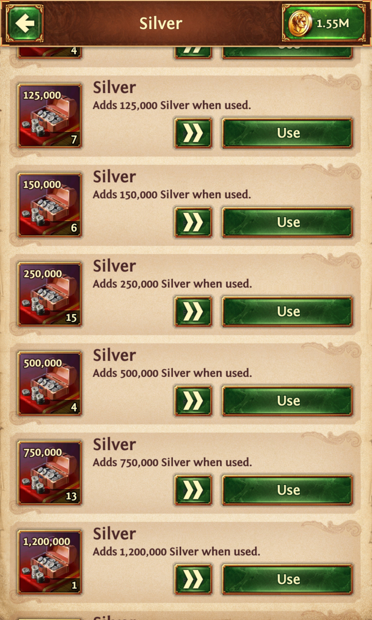 Android-Version: Drücke in der oberen Leiste auf Stein, Eisen, Holz oder Silber. Es öffnet sich ein Ressourcenfenster. Drücke auf die benötigte Ressource wie Stein, Holz, Eisen oder Silber. Ein Inventarfenster öffnet sich und die benötigte Ressource kann freigegeben werden.
