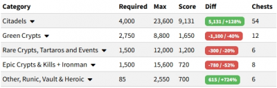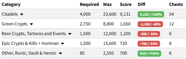 ⇒ Alle Kategorien „Citadels, Green Crypts…“ sollten mit den minimalen „Required“ Punkten erledigt werden.
