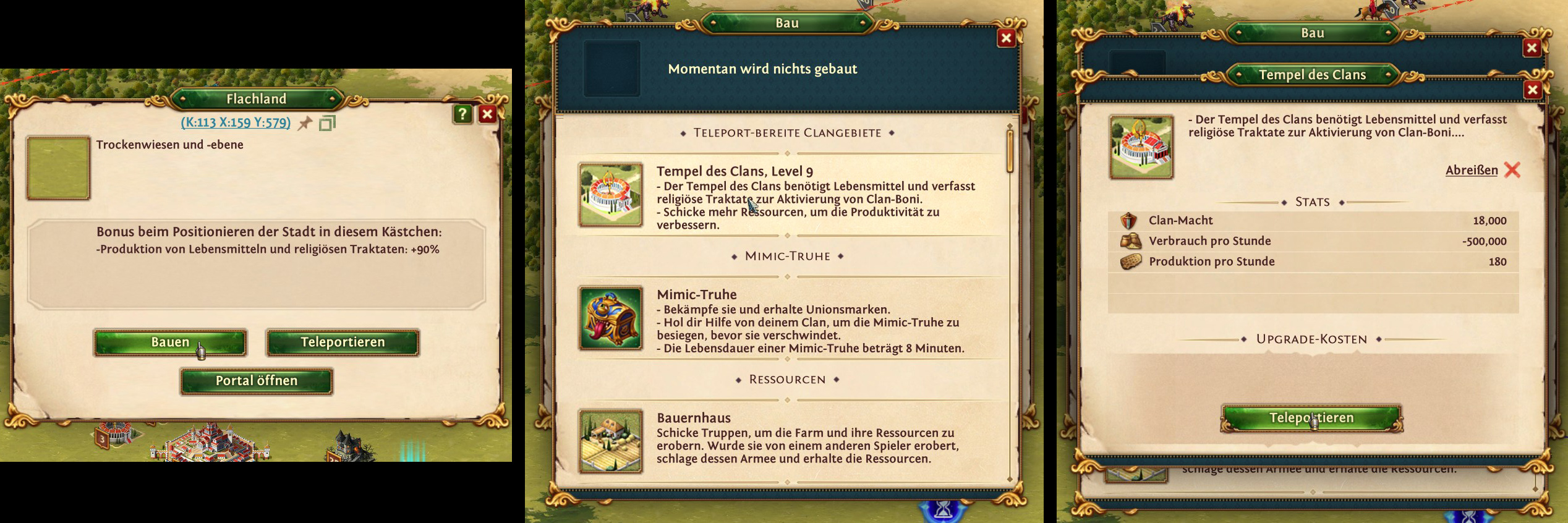 Um den Clan teleportieren zu lassen sind eine erhebliche Menge Gold und Ressourcen wie Holz, Eisen und Stein notwendig. Ein Clan umzusiedeln zu lassen, ist einfacher als gedacht. Kein Mitglied tritt aus dem Clan aus! Ich habe sicherheitshalber alle Geschenke öffnen und die Aktivitäten einstellen lassen. Am Besten auch keine neuen Dörfer oder Minen mehr erstellen. Teleport innerhalb des Königreichs benötigt jeder Mitspieler, auch der Clanführer, einen Stadt-Teleport. Dieser kostet 27k Gold! Für einen Teleport in ein anderes Königreich werden 180k Gold nur für die Spieler benötigt und im ungünstigsten Fall zusätzlich ein Stadt-Teleport von nochmals 27k Gold. Erst an die Grenze teleportieren, dann in das neue Clangebiet.