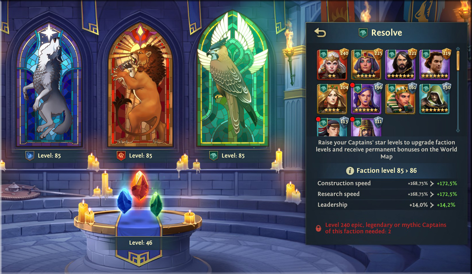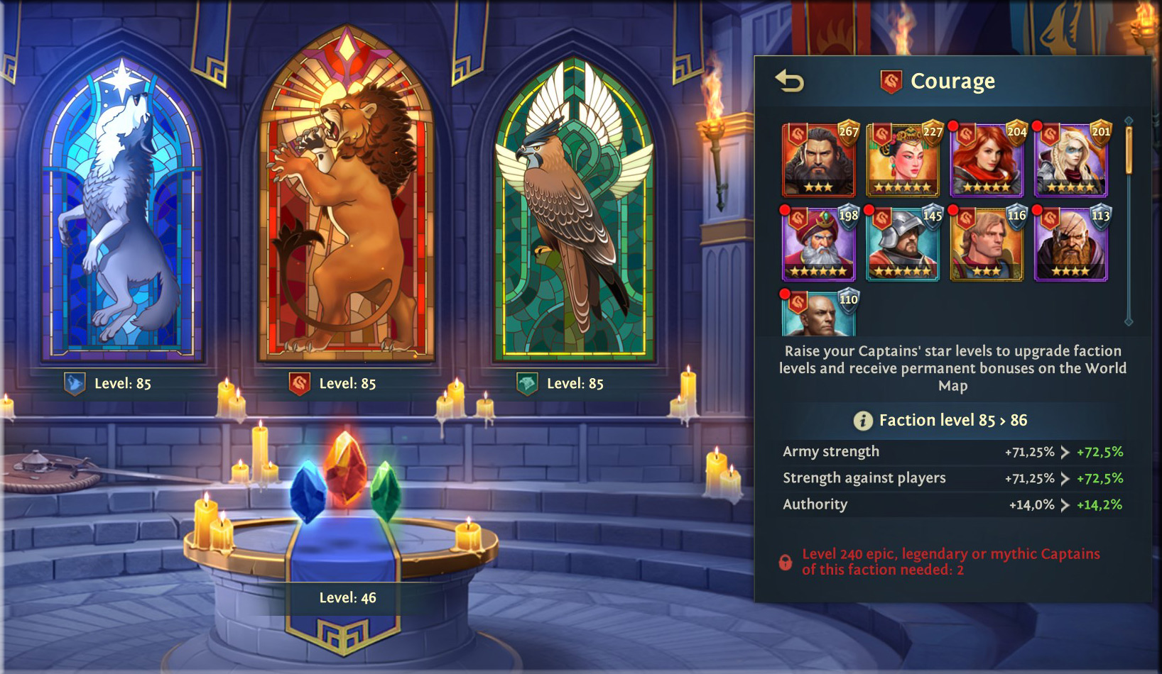 Mit dem vergeben von Sternen für die Hauptmänner und durch das Hochstufen von epischen, legendären und mythischen Hauptmännern werden verschiedene Eigenschaften in der Ruhmeshalle gelevelt. Die drei Schreinrubriken sind die Beharrlichkeit, Mut und Entschlossenheit. Zu Beginn müssen die Hauptmänner mit einem Stern ausgestattet werden. Ab einem Hauptmann mit Stern und Level 20 werden spezielle Bedingungen gefordert, um in der Ruhmeshalle weiteren Ruhm zu ernten.