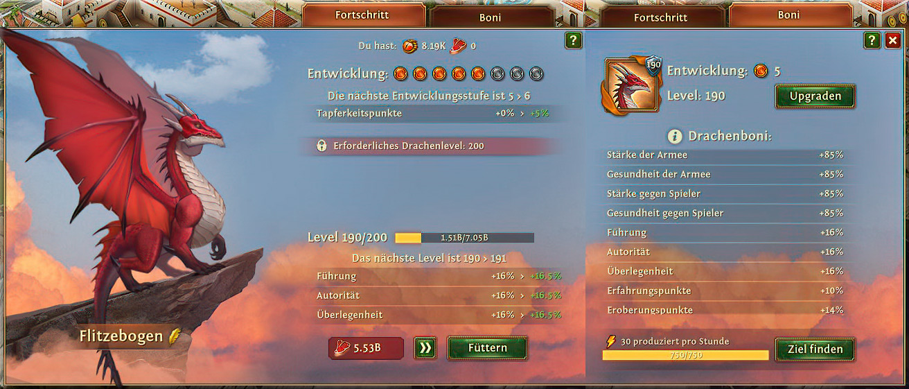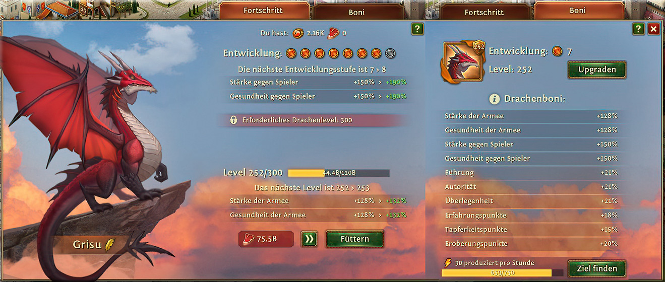 Für den Anfang bietet uns der Drache die Boni -Stärke der Armee und -Gesundheit der Armee. In der weiteren Entwicklung unseres Begleiters werden weitere Eigenschaften freigeschaltet wie: