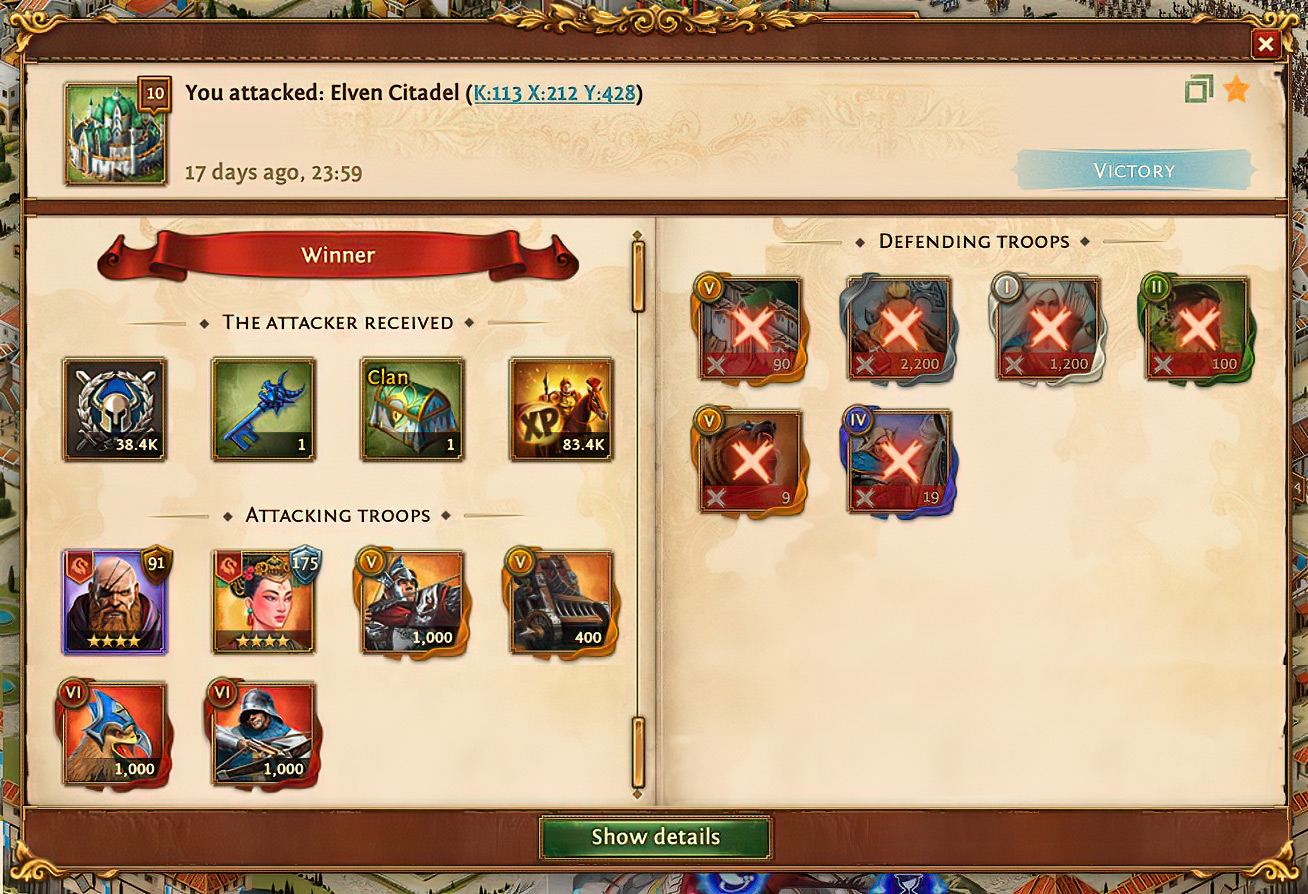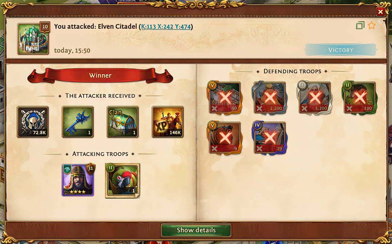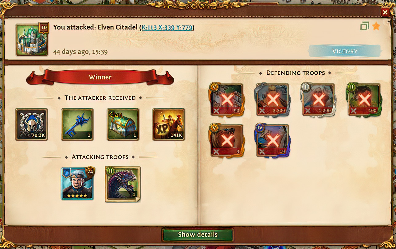 Angriff auf eine Elfenfestung Level 10 mit Söldnern. Die Söldner haben so viel Power unter der Haube, da ist es manchmal uninteressant, welchen Hauptmann man einpackt und mitnimmt. Helena ist das beste Beispiel dafür, das die Söldner alles im Alleingang erledigen.