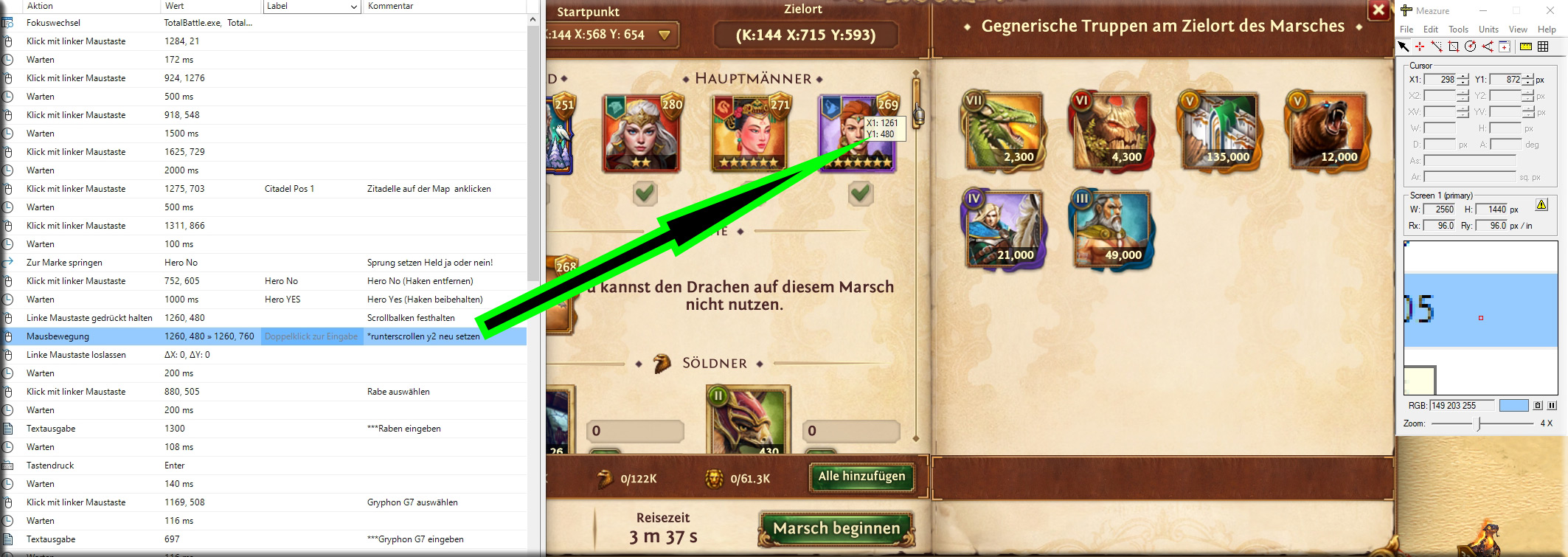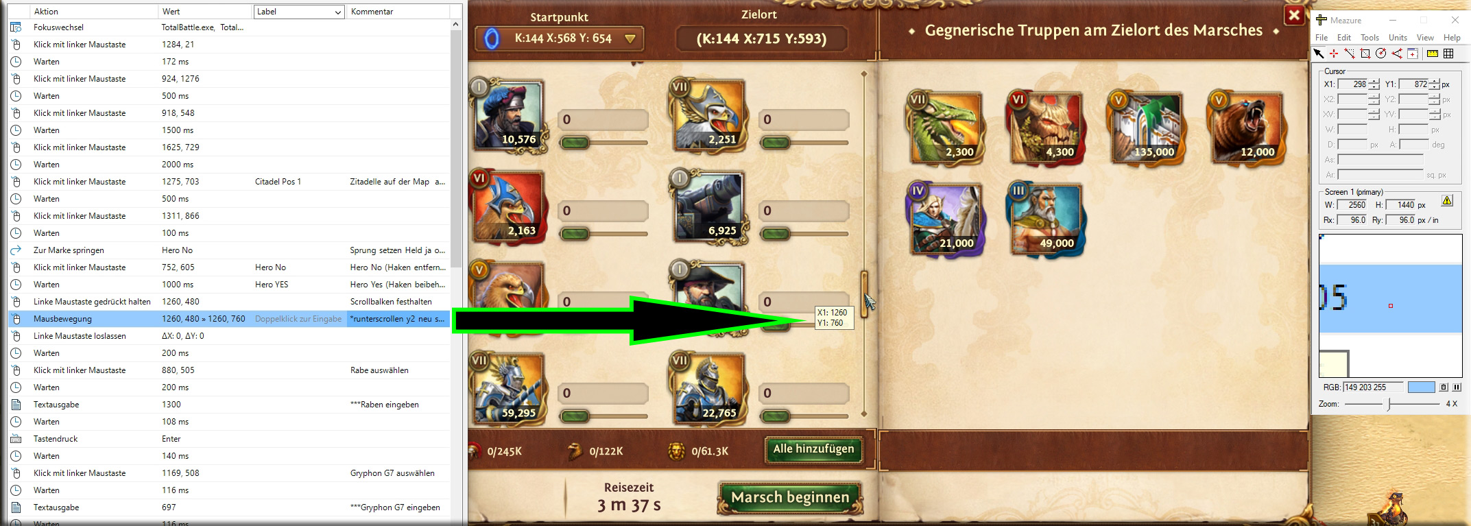 Die Beispiel Datei für den Macro-Recorder muss je nach Bildschirmgröße und eigenen Truppen in der Stadt angepasst werden. Die Datei vom Macrorecorder funktioniert auf einem Monitor in der Auflösung 2560 x 1440 Pixel mit gestartetem Total Battle PC Client (Fenstermodus maximiert, nicht Vollbildmodus). Das Macro-Script vom 25-10-2025 wurde nochmals modifiziert, Popup-Fenster eingeführt, eine Zweitwahl der Zitadelle eingeführt, falls die erste schon angelaufen wird und Infos, wenn die Scrollfunktion nicht passt, dass +17 Pixel bzw. -17 Pixel pro Bildreihe beim y-Wert angepasst werden können, um zu dem Bild der gewünschten Truppe zu gelangen. In Planung: OCR-Erkennung für die Scrollfunktion.