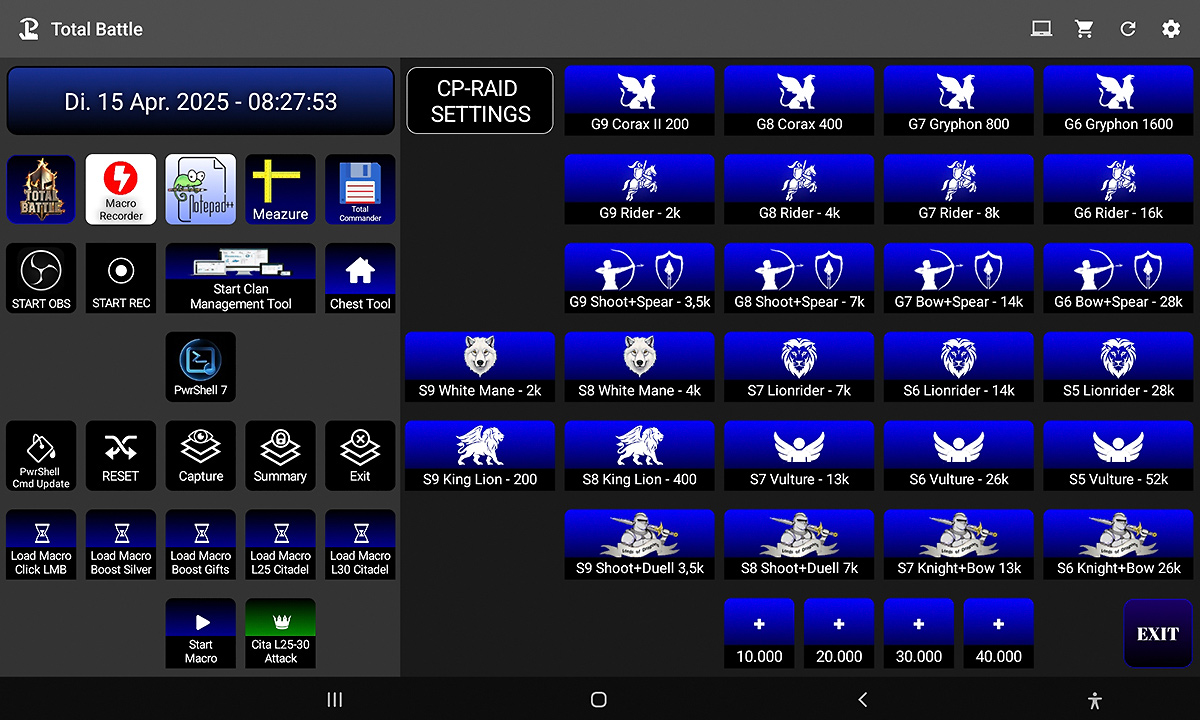 Für Total Battle habe ich ein Panel erstellt, welches mir die wichtigsten Funktionen auf einer Seite gewährt. Für unsere Spielerstatistik „Truhenzähler, Punktewertung“ startet ein Script für Powershell um die Truhen mit OCR abzuholen „Capture“ und eine Zusammenfassung „Summary“ am Ende des Tages zu erstellen. Weiterhin nutze ich den Macrorecorder um Zitadellen, so bequem wie möglich, anzugreifen. Das Meazure-Tool hilft, wenn der Schiebebalken auf eine neue y-Position gebracht werden muss. Die CP-Raid Settings sind praktisch, bei einem Eroberungspunktelauf. Die Einheiten der verschiedenen Truppen werden mit einem Knopfdruck übertragen. Verstärkung - Team auswählen und nun in das Feld für Raben mit der Maus klicken und den „Button“ G9 Corax 400 drücken, weiter zu den Gryphons und so weiter.