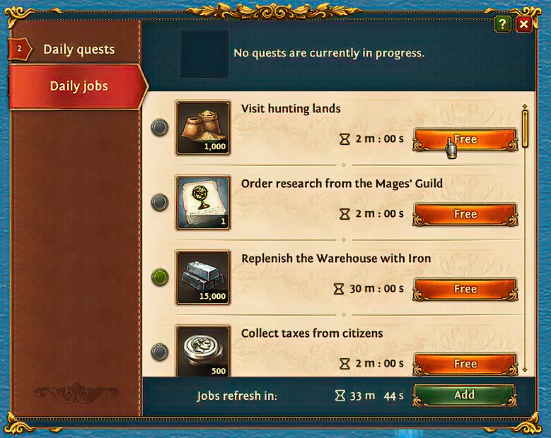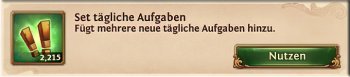Um in die Rangliste zu gelangen solltest Du jede Menge tägliche Aufgaben erledigen. Gehe zu dem Menü Aufgaben im unteren Menübereich und dann weiter zu den Täglichen Aufgaben. In diesem Aufgabenfenster erscheinen zirka alle 2-3 Stunden neue Aufgaben. Diese täglichen Aufgaben können abgearbeitet, oder sofort eingesammelt werden. Bei den Aufgaben erhält man Gold, Eisen, Holz, Silber, Baupläne und weitere Gegenstände.