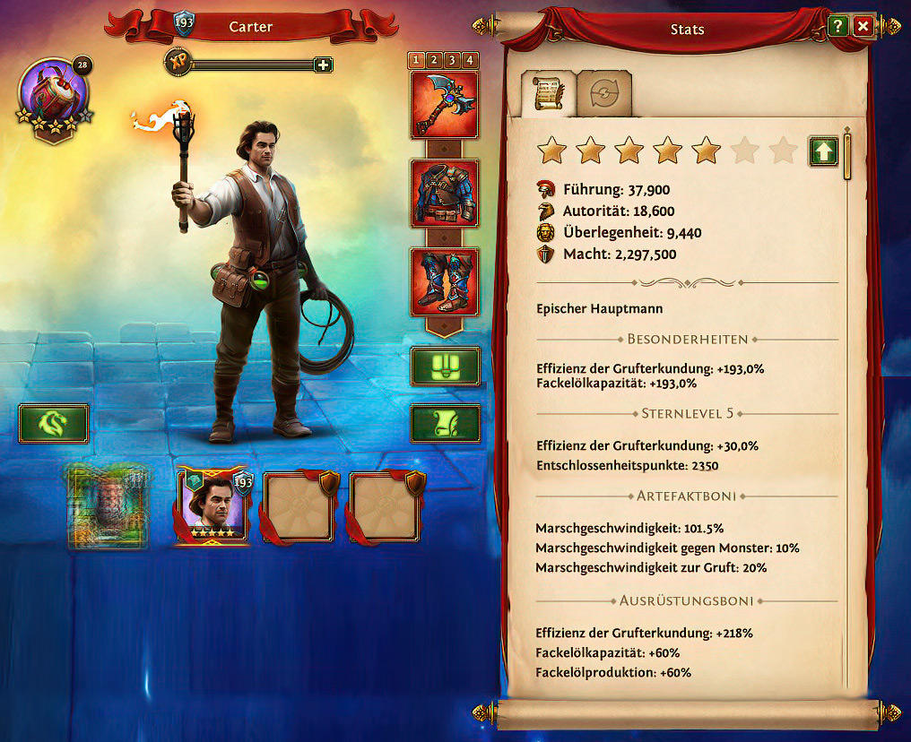 Mit jedem Level des epischen Hauptmanns steigt seine Effizienz der Grufterkundung und die Fackelölkapazität um 1%. Rüstet Ihr Carter mit Sternen aus, dann liegt das Maximum bei 70% Effizienz der Grufterkundung und 9100 Entschlossenheitspunkte. Die Trommel ist ein ideales Artefakt für Carter und beschleunigt die Marschgeschwindigkeit zur Gruft.