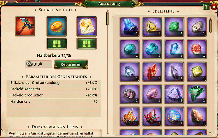 Jeder Ausrüstungsgegenstand kann nochmals modifiziert werden mit einem Edelstein und einem Zauber. Der seltene und blaue Edelstein Amber erhöht die Effizienz der Grufterkundung um 22%. Der epische und lila Zauber des Pioniers erhöht die Effektivität der Grufterkundung um 12%. Wer Carter im Portfolio hat, ist verpflichtet, jede Gruft mit dem Fackelträger anzulaufen. Wenn Ihr zum Gruften einen anderen Hauptmann benutzt, dann bitte nur zum kurzfristigen Leveln, ansonsten wechselt umgehend das Spiel!