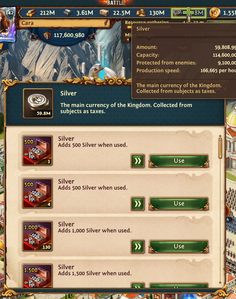 Android-Version: Drücke in der oberen Leiste auf Stein, Eisen, Holz oder Silber. Es öffnet sich ein Ressourcenfenster. Drücke auf die benötigte Ressource wie Stein, Holz, Eisen oder Silber. Ein Inventarfenster öffnet sich und die benötigte Ressource kann freigegeben werden.