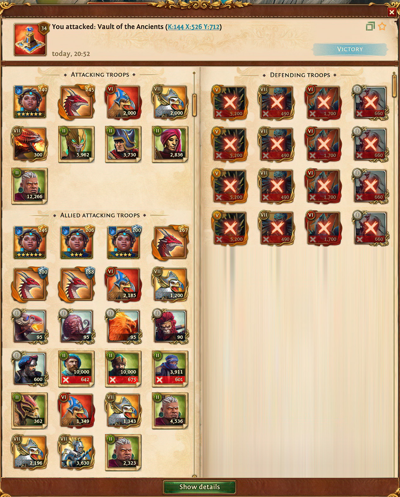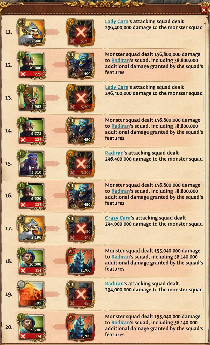 Anfangs stand ein gegnerischer Runen-Monstertrupp mit 2,9 Millionen Einheiten uns gegenüber. Diese wurden auf 1,7 Millionen reduziert und durften einen Gegenschlag ausführen bis die Einheiten so weit reduziert waren, dass wir diese mit 300k Einheiten und weniger letztendlich besiegen konnten. Bei einem derart starken Gegner, richtet dieser höllischen Schaden an, wenn die Truppen nicht von Anfang an besiegt werden. Bei den Verlusten muss eine Menge Gold oder Heiltränke aufgebracht werden, um die Söldner wieder zu beleben.