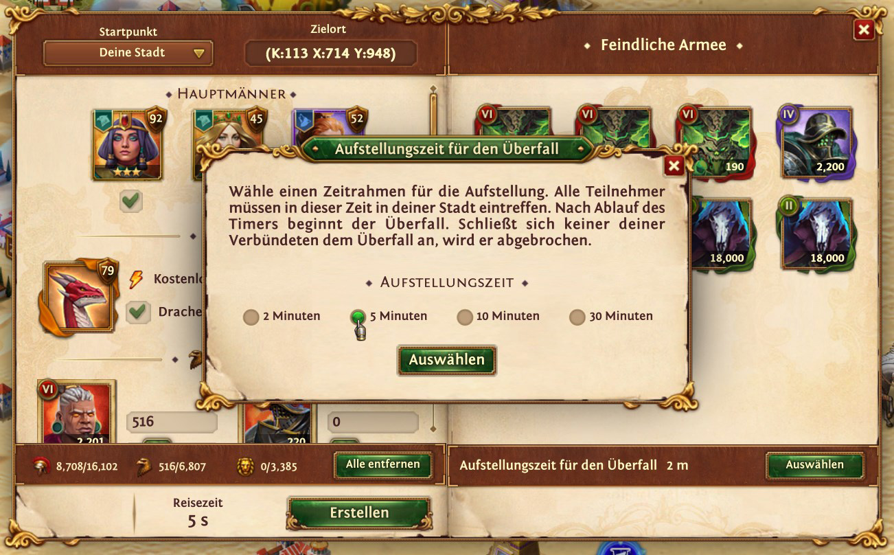 Bevor Du einen Überfall startest, vergiss nicht die Zeit vernünftig einzustellen. Die voreingestellte Zeit von 2 Minuten kann in extremen Situationen verwendet werden. Damit Deine Mitspieler nicht unnötig Marschbooster verschwenden müssen, stelle die Zeit auf angenehme 5 Minuten.