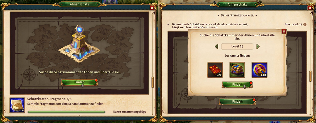 ist man auch im Besitz der sechs Schatzkarten-Fragmente. Diese können nun nach und nach freigelegt werden. Wenn das letzte Fragment freigelegt wurde, kann man nun auf ZUSAMMENFÜGEN drücken. Die einzelnen Fragmente werden zur Schatzkarte, diese führt zum Ahnenschatz, dem Ahnen-Turm.