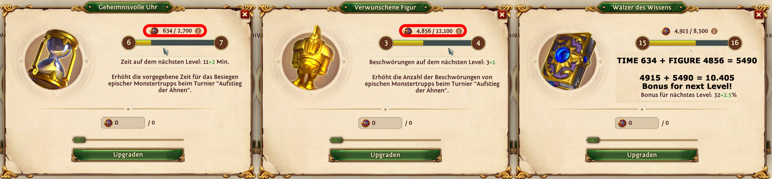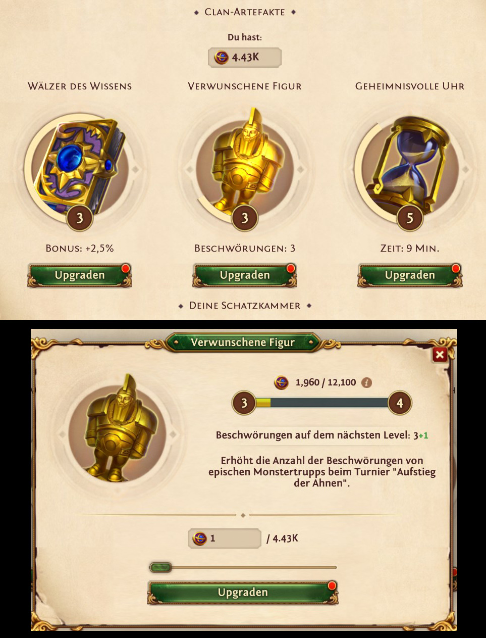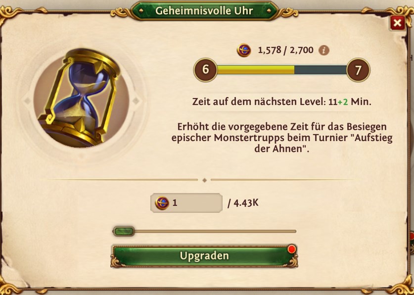Die Punktevergabe, oder besser, wohin mit den verdienten Ahnenmünzen nach dem Überfall? Nehmen wir mal das untere Beispiel und wir sind im Besitz von 4.43k Münzen. Bei der Figur für eine weitere Beschwörung benötigt man bis zum Ziel 12.100 Münzen. Es wurden schon 1.960 Münzen eingezahlt. Das bedeutet 12.100 minus 1.960 = 10.140 (10k) Münzen für eine weitere Figur. Da kommt man mit 4.43k nicht sonderlich weit.