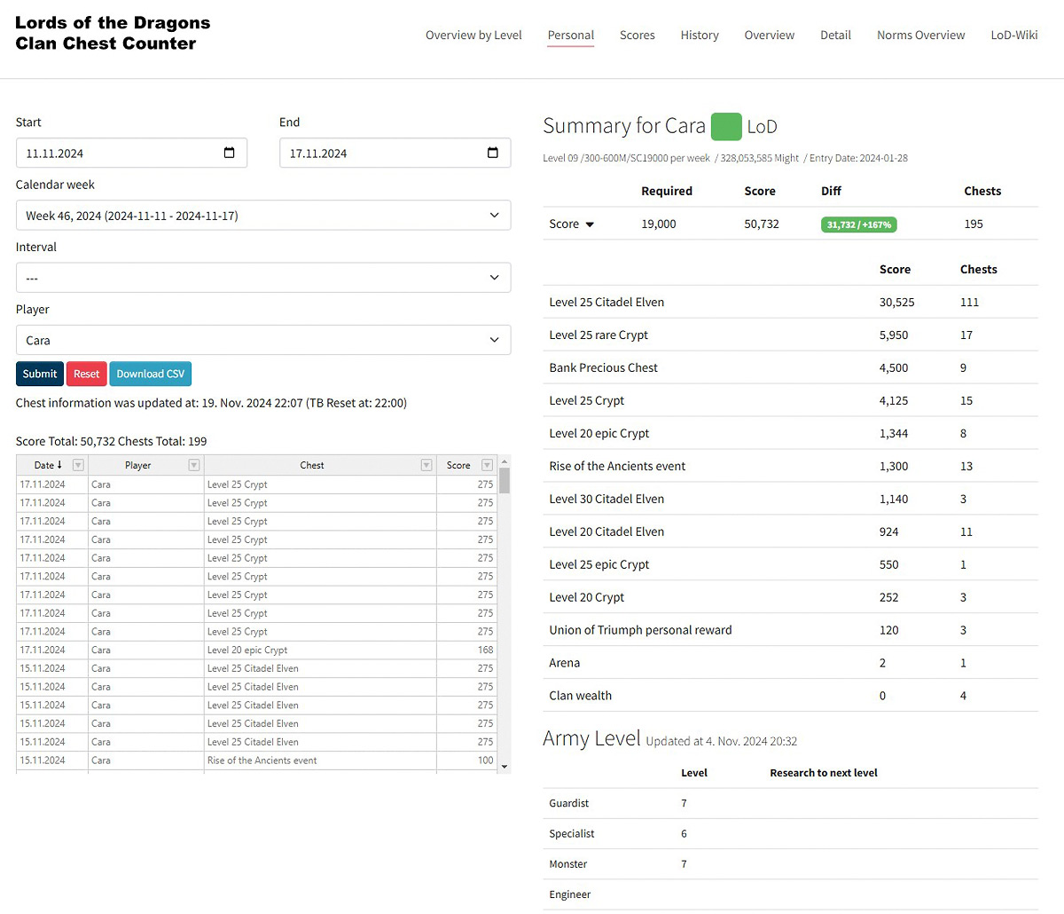 Das Lords of Dragons CCC-Portal kann ohne Logindaten aufgerufen werden und zeigt bei OVERVIEW BY LEVEL eine faire Übersicht der Spieler, welche in Level- und Machtgruppen eingeteilt sind. Ein Spieler mit einer Macht von 250 Millionen hat andere Anforderungen der Sollpunkte, als ein Spieler mit 500 Millionen Macht.