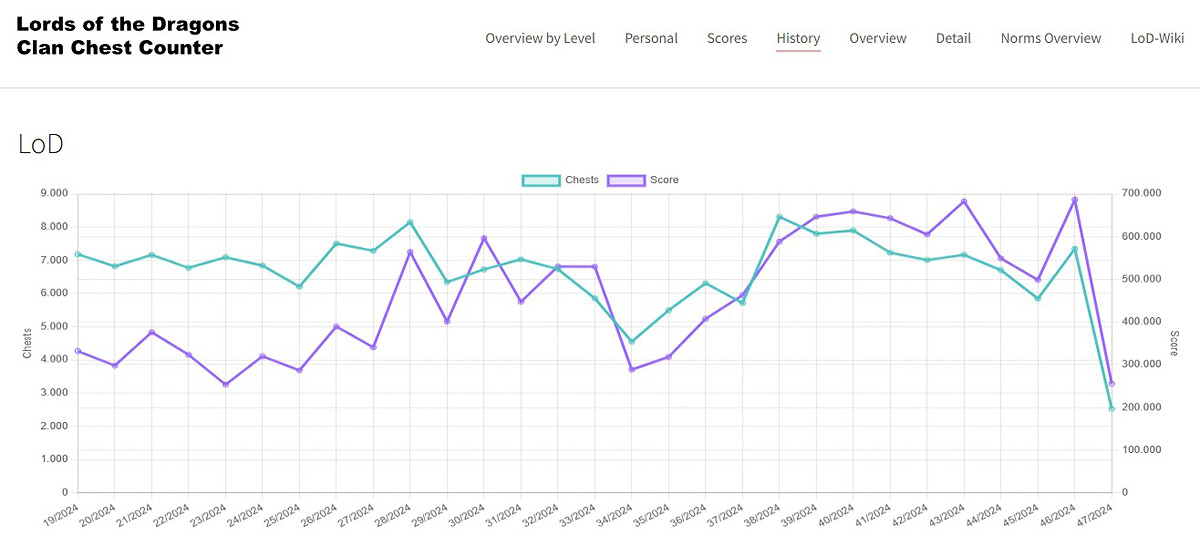 In dieser Ansicht kann jeder Spieler mit der Einzelstatistik angezeigt werden. Hier kann geprüft werden, wie viele Punkte noch bis zum Stichtag gemacht werden müssen, oder ob das Ziel schon erreicht wurde. Wenn man zum Beispiel Defizite hat und möchte schauen, wie ein anderer Spieler in seiner Levelgruppe die Punkte erreicht, kann dieser Spieler ausgewählt werden. Es wird die aktuelle Macht des Spielers, eine eventuelle Abwesenheit, die zu erreichenden Punkte pro Woche, welche Truhen eingeholt wurden und vieles mehr angezeigt.