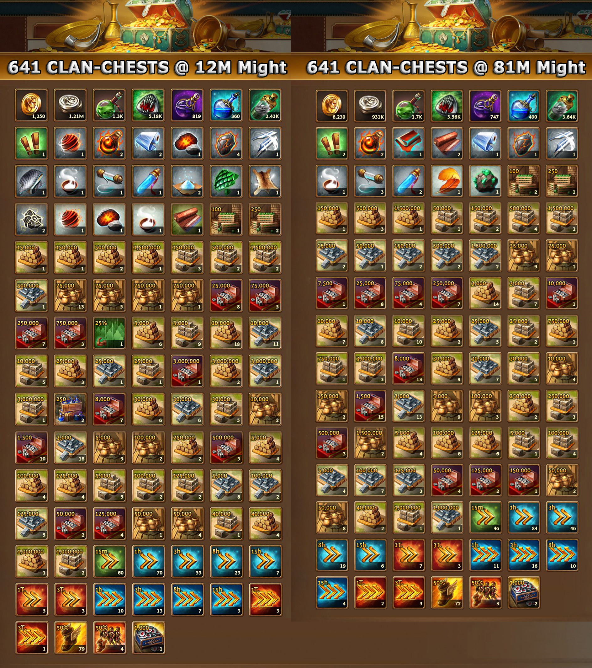 Bei einer Abholung von überwiegend Level 10-15 Clantruhen wurden nach knapp 19 Stunden insgesamt 641 Clantruhen mit 2 Städten von unterschiedlichen Machtverhältnissen zeitgleich eingesammelt. Die Ressourcen, wie Holz, Steine, Eisen, Silber und Lebensmittel sind unterschiedlich verteilt. Die kleinere Stadt mit einer Macht von 12M zieht bei den Steinen den Kürzeren, aber gleicht diese durch das Silber wieder aus. Insgesamt kommen beide Städte auf ein identisches Gesamtergebnis von knapp 40 Millionen Ressourcen.