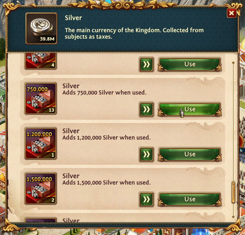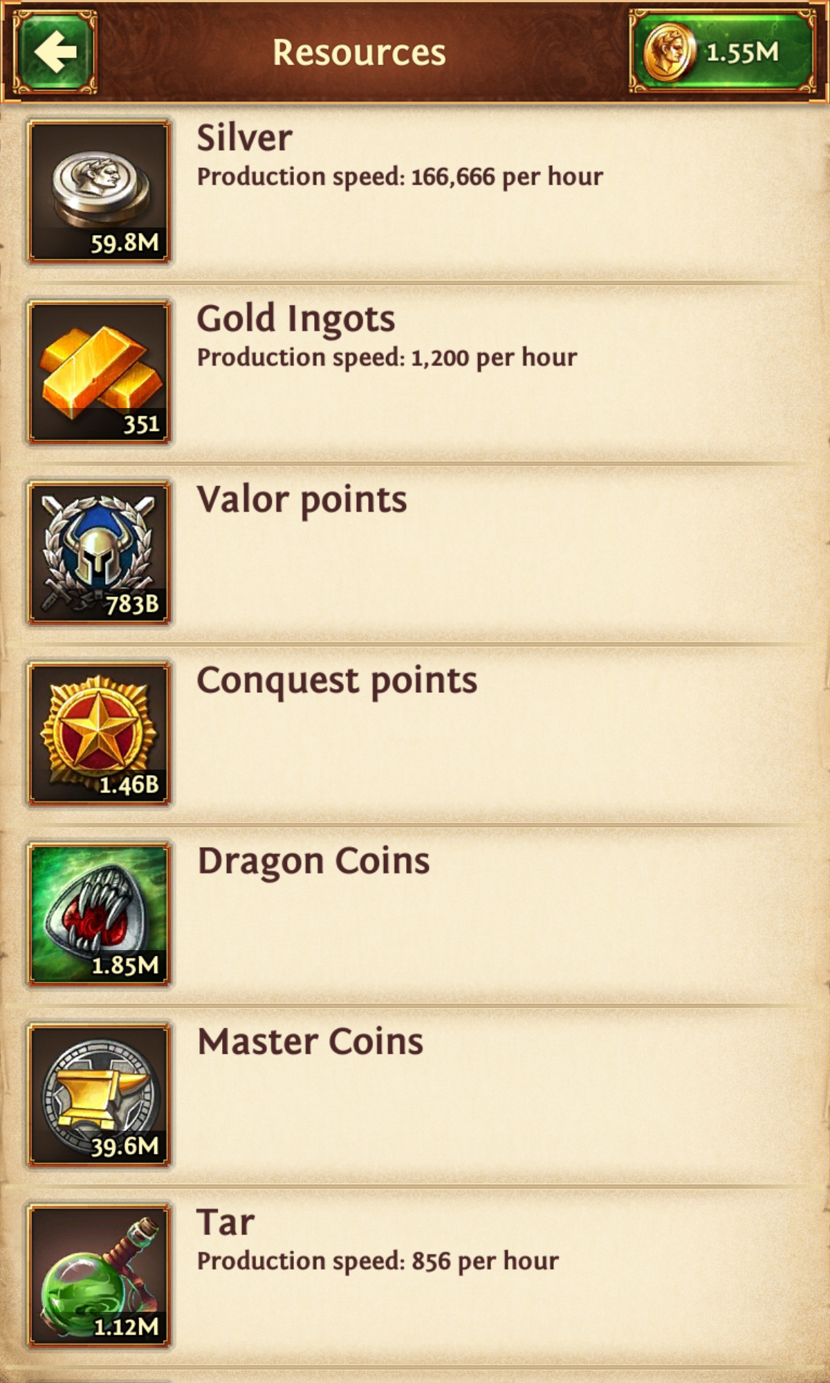 Android-Version: Drücke in der oberen Leiste auf Stein, Eisen, Holz oder Silber. Es öffnet sich ein Ressourcenfenster. Drücke auf die benötigte Ressource wie Stein, Holz, Eisen oder Silber. Ein Inventarfenster öffnet sich und die benötigte Ressource kann freigegeben werden.