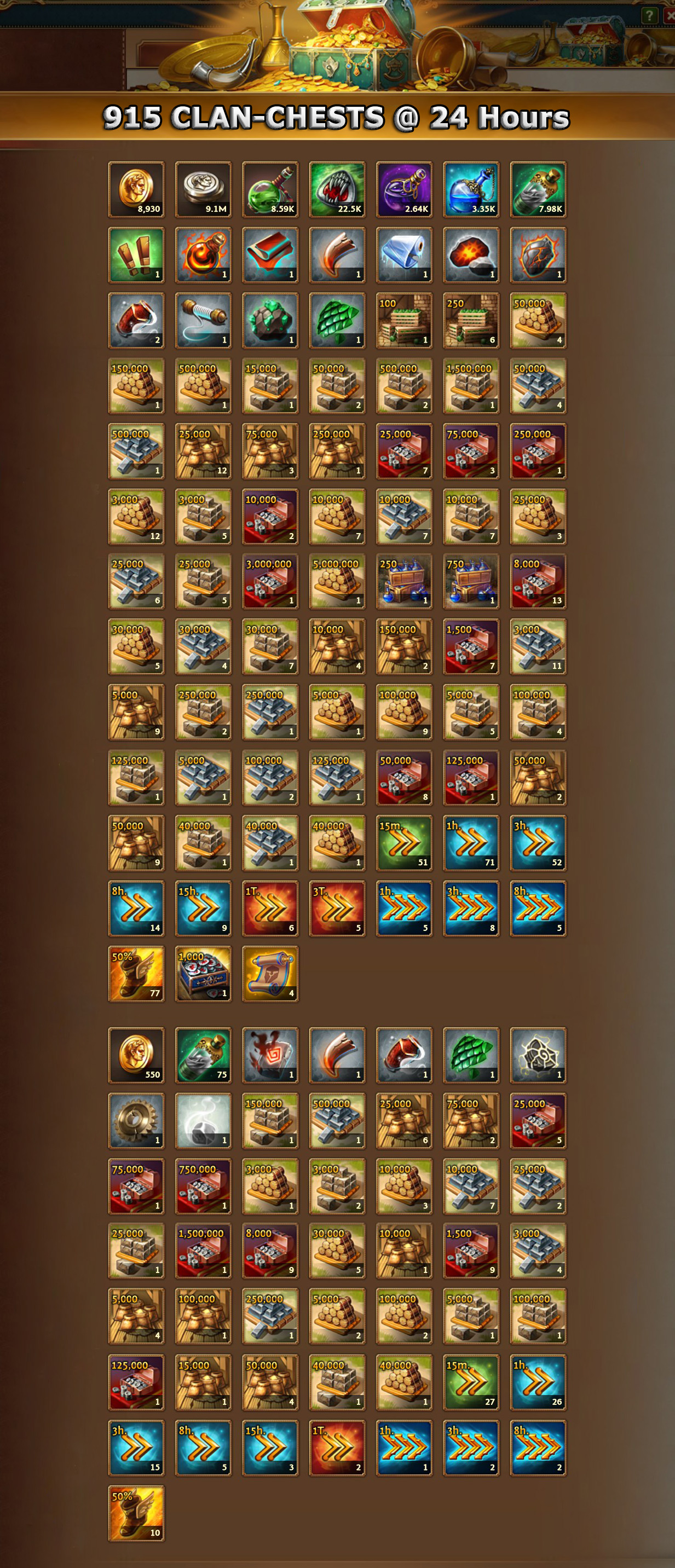 in den 915 Clantruhen waren gesamt enthalten: Holz 7.559.000 = 7,5M Steine 4.311.000 = 4,3M Eisen 2.575.000 = 2,5M Silber 15.916.000 = 15,9M