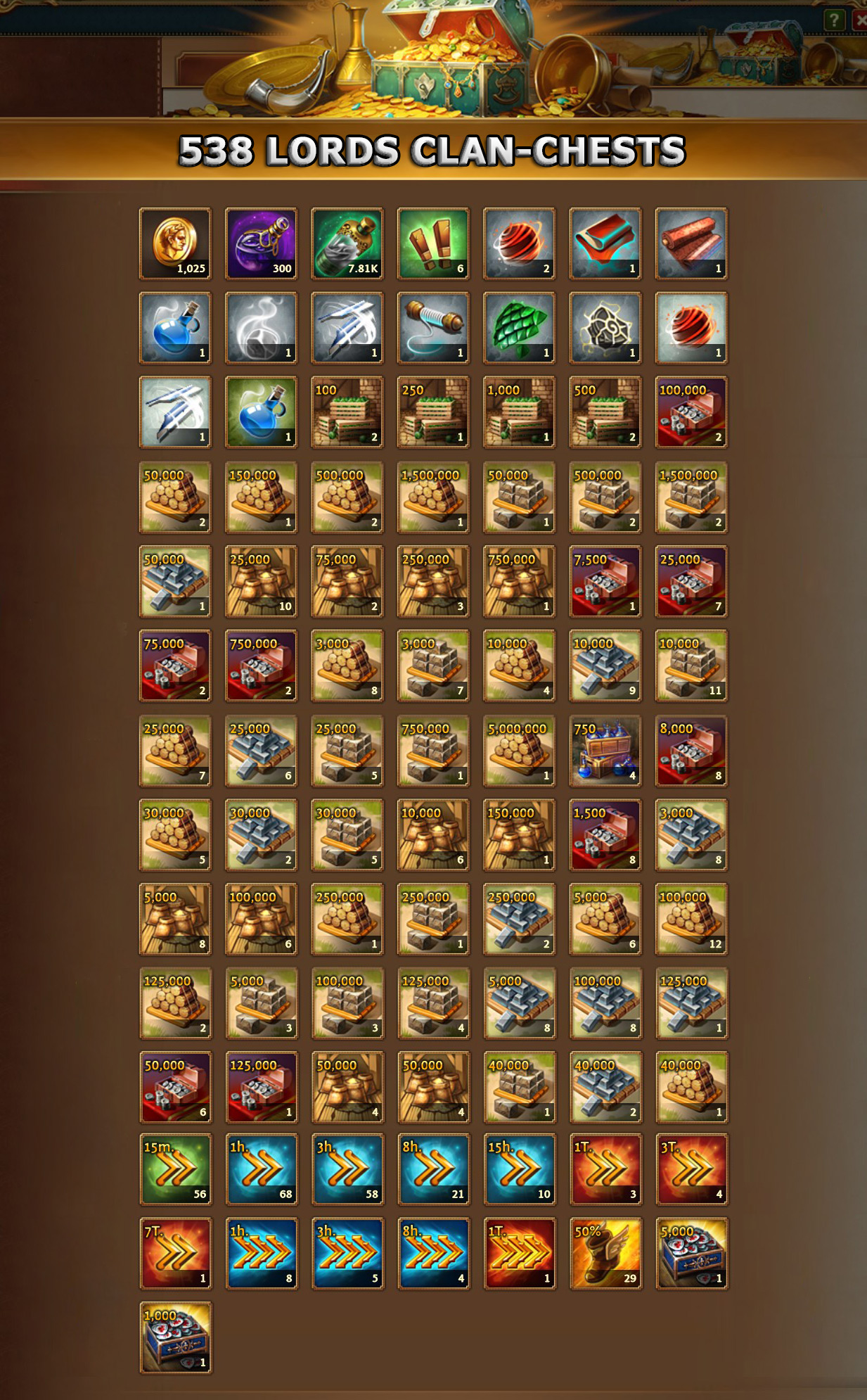 Bei 827 Clantruhen wurden die Ressourcen zusammengerechnet, dabei kamen folgende Ergebnisse zusammen: Insgesamt 72 Einheiten Holz mit 5.464.000 = 5,4M Holz Insgesamt 82 Einheiten Stein mit 13.278.000 = 13,2M Steine Insgesamt 84 Einheiten Eisen mit 14.259.000 = 14,2M Eisen Insgesamt 77 Einheiten Silber mit 4.804.500 = 4,8M Silber