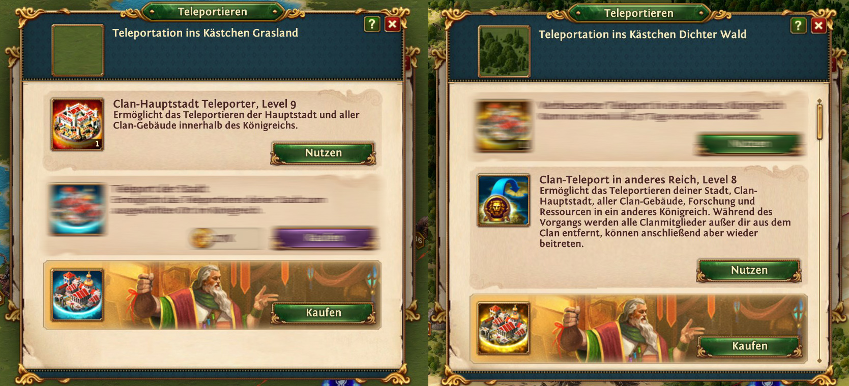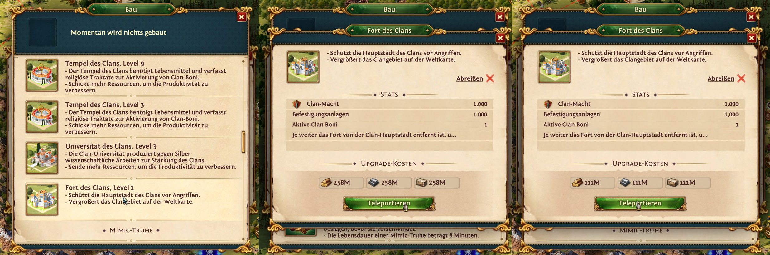 Um den Clan teleportieren zu lassen sind eine erhebliche Menge Gold und Ressourcen wie Holz, Eisen und Stein notwendig. Ein Clan umzusiedeln zu lassen, ist einfacher als gedacht. Kein Mitglied tritt aus dem Clan aus! Ich habe sicherheitshalber alle Geschenke öffnen und die Aktivitäten einstellen lassen. Am Besten auch keine neuen Dörfer oder Minen mehr erstellen. Teleport innerhalb des Königreichs benötigt jeder Mitspieler, auch der Clanführer, einen Stadt-Teleport. Dieser kostet 27k Gold! Für einen Teleport in ein anderes Königreich werden 180k Gold nur für die Spieler benötigt und im ungünstigsten Fall zusätzlich ein Stadt-Teleport von nochmals 27k Gold. Erst an die Grenze teleportieren, dann in das neue Clangebiet.