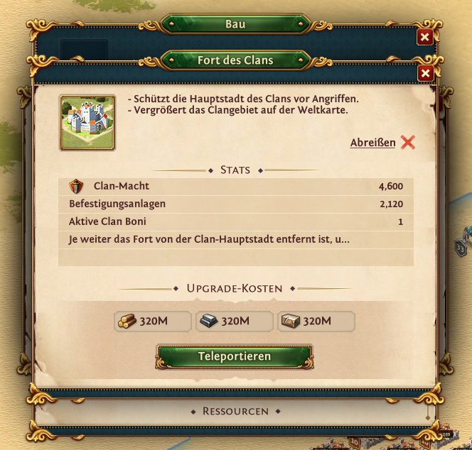 Nachtrag: Zur damaligne Zeit des Clanumzugs waren wir alle noch kleine Spieler mit wenig Ressourcen und Beschleunigern. Mit Spielern von 200-600M Macht und etlichen Ressourcen und Beschleunigern können Clangebäude innerhalb von 48 Stunden von Level 1 auf Level 25 hochgepusht werden. Bei großen Spielern kann es vorteilhaft sein, die Forts abzureißen.