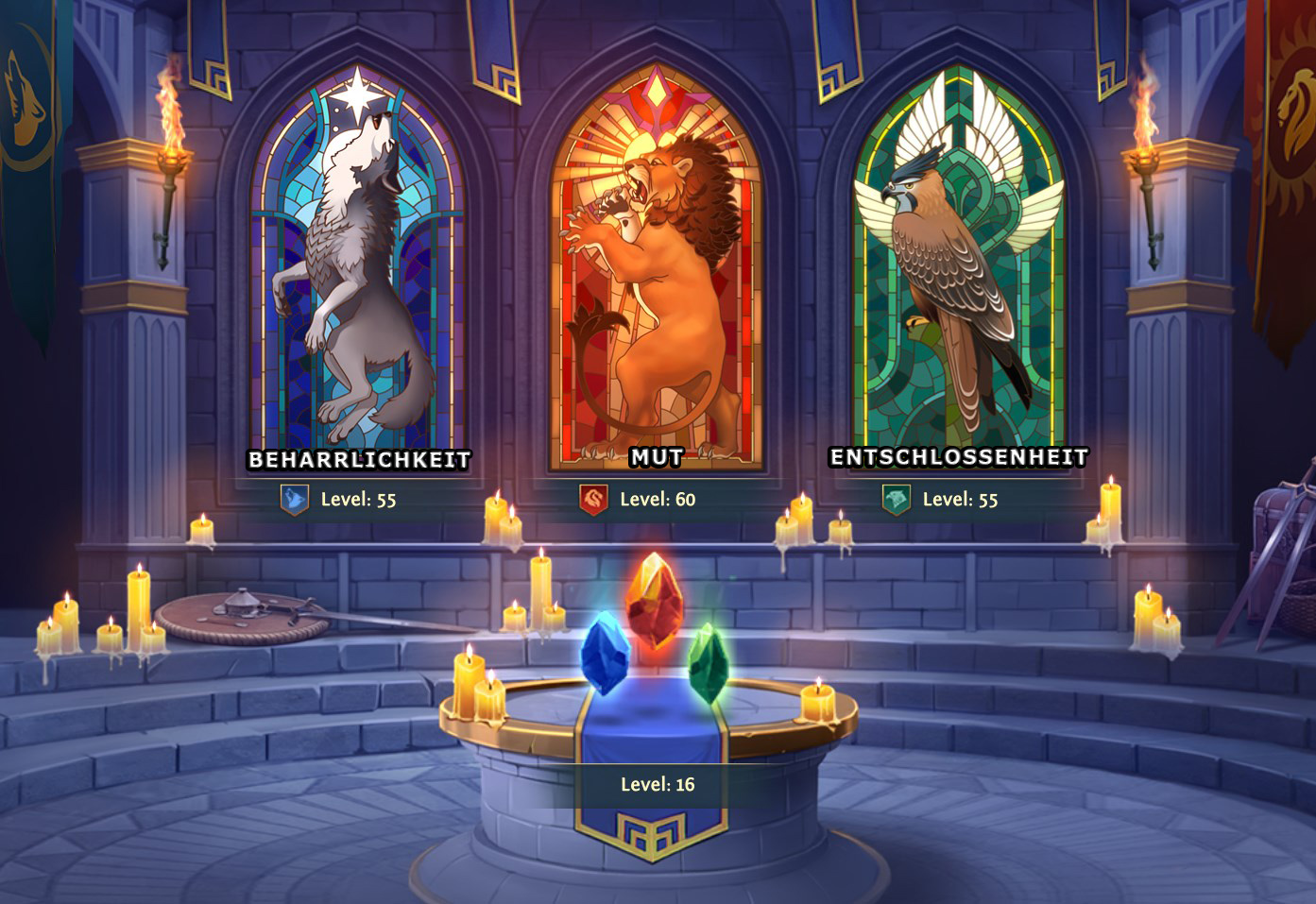 Ab Level 45 bei Beharrlichkeit, Mut und Ruhm können in der Mitte am Schrein folgende Eigenschaften gestärkt werden: