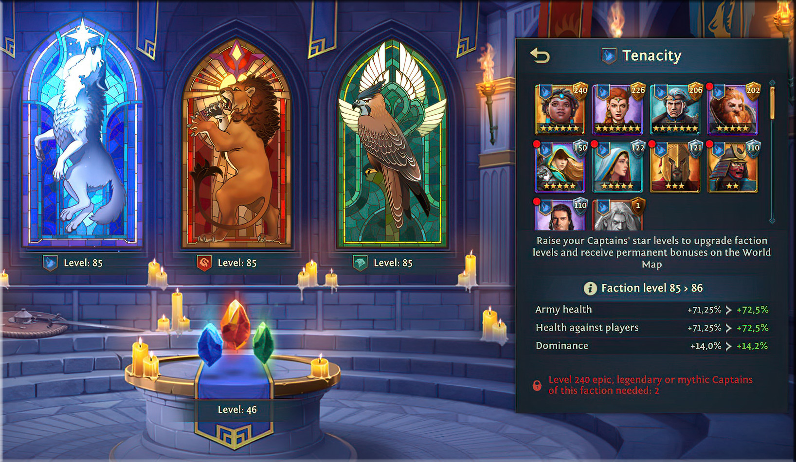 Mit dem vergeben von Sternen für die Hauptmänner und durch das Hochstufen von epischen, legendären und mythischen Hauptmännern werden verschiedene Eigenschaften in der Ruhmeshalle gelevelt. Die drei Schreinrubriken sind die Beharrlichkeit, Mut und Entschlossenheit. Zu Beginn müssen die Hauptmänner mit einem Stern ausgestattet werden. Ab einem Hauptmann mit Stern und Level 20 werden spezielle Bedingungen gefordert, um in der Ruhmeshalle weiteren Ruhm zu ernten.