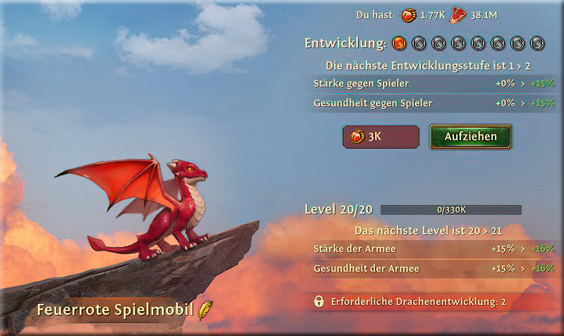 Für den Anfang bietet uns der Drache die Boni -Stärke der Armee und -Gesundheit der Armee. In der weiteren Entwicklung unseres Begleiters werden weitere Eigenschaften freigeschaltet wie:
