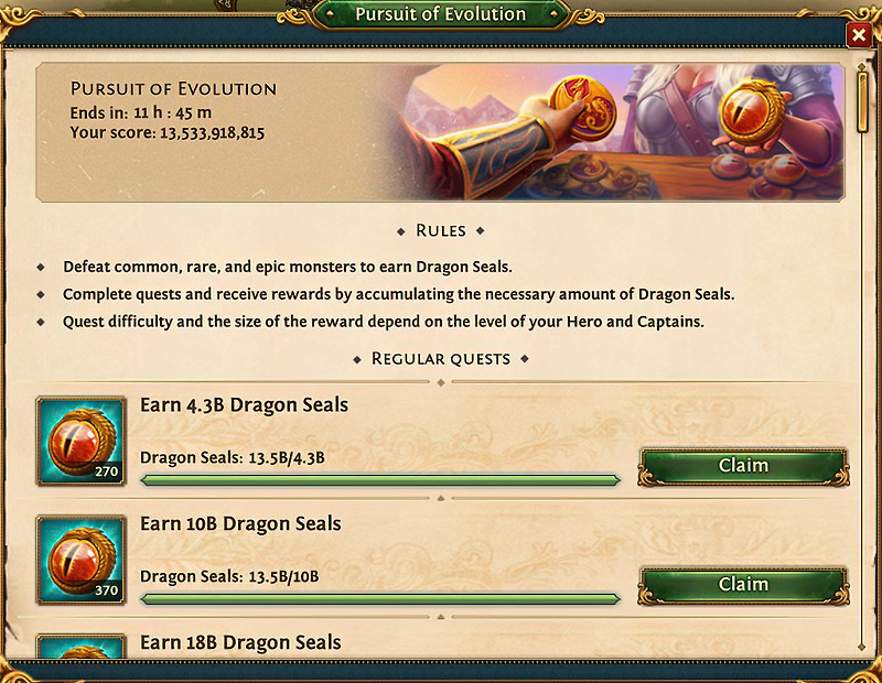 Für die nächste Stufe der Entwicklung benötigt dein Begleiter seltene Drachenkugeln. Drachenkugeln können erkämpft werden bei der Teilnahme an dem Turnier „Streben nach Entwicklung“. Drachenkugeln können ebenfalls erhalten werden in der Triumphalen Herausforderung mit dem Elitepass, im Triumphalen Shop, im Shop Union des Triumphs und in den Ressourcen-Auswahltruhen als Belohnungen für Unionsmarken.