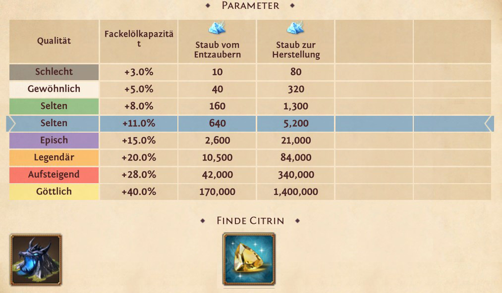 Die Ausrüstung „Set des Archäologen“ unterstützt Deine Fackelölproduktion und deine Fackelölkapazität. Auf der Stufe Göttlich (Farbe Gold) sind es jeweils 30%. Um das Maximum herauszuholen, statte das Set mit Edelsteinen, sowie Zaubern für Fackelölproduktion und Fackelölkapazität aus. Mit der Eigenschaft der Fackelölkapazität und Fackelölproduktion kann die Ausrüstung der Allwissenheit nicht mithalten. Wenn nicht gespielt wird, kann diese Ausrüstung von Nutzen sein, wenn sie einem Hauptmann angelegt wird.