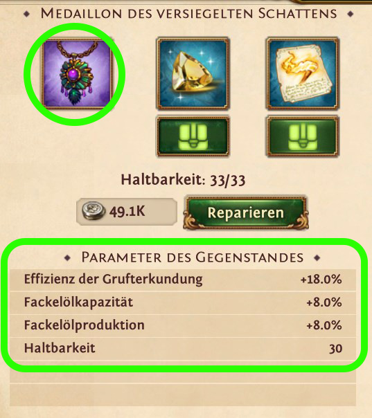 Wir ergänzen einen freien Slot von Carter mit einem Medaillon des versiegelten Schattens. Dieser Gegenstand hat folgende Eigenschaften: