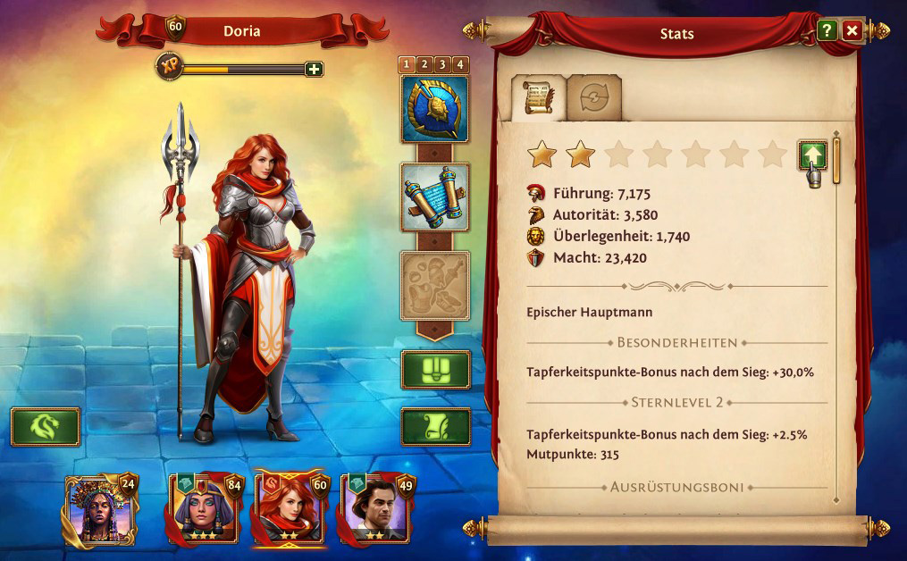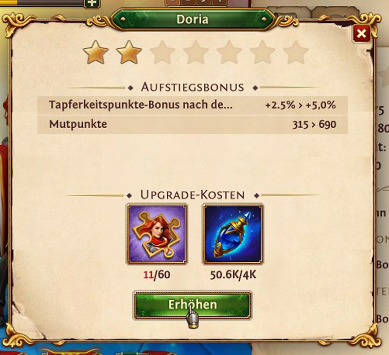 ergibt ein oder mehrere Kartenfragmente. Die Kartenfragmente werden zufällig erstellt und wenn ein Hauptmann noch nicht freigeschaltet ist, so kann dieser mit den gesammelten Kartenfragmenten freigeschaltet werden oder stuft einen vorhandenen Hauptmann auf das nächste Sternenlevel.
