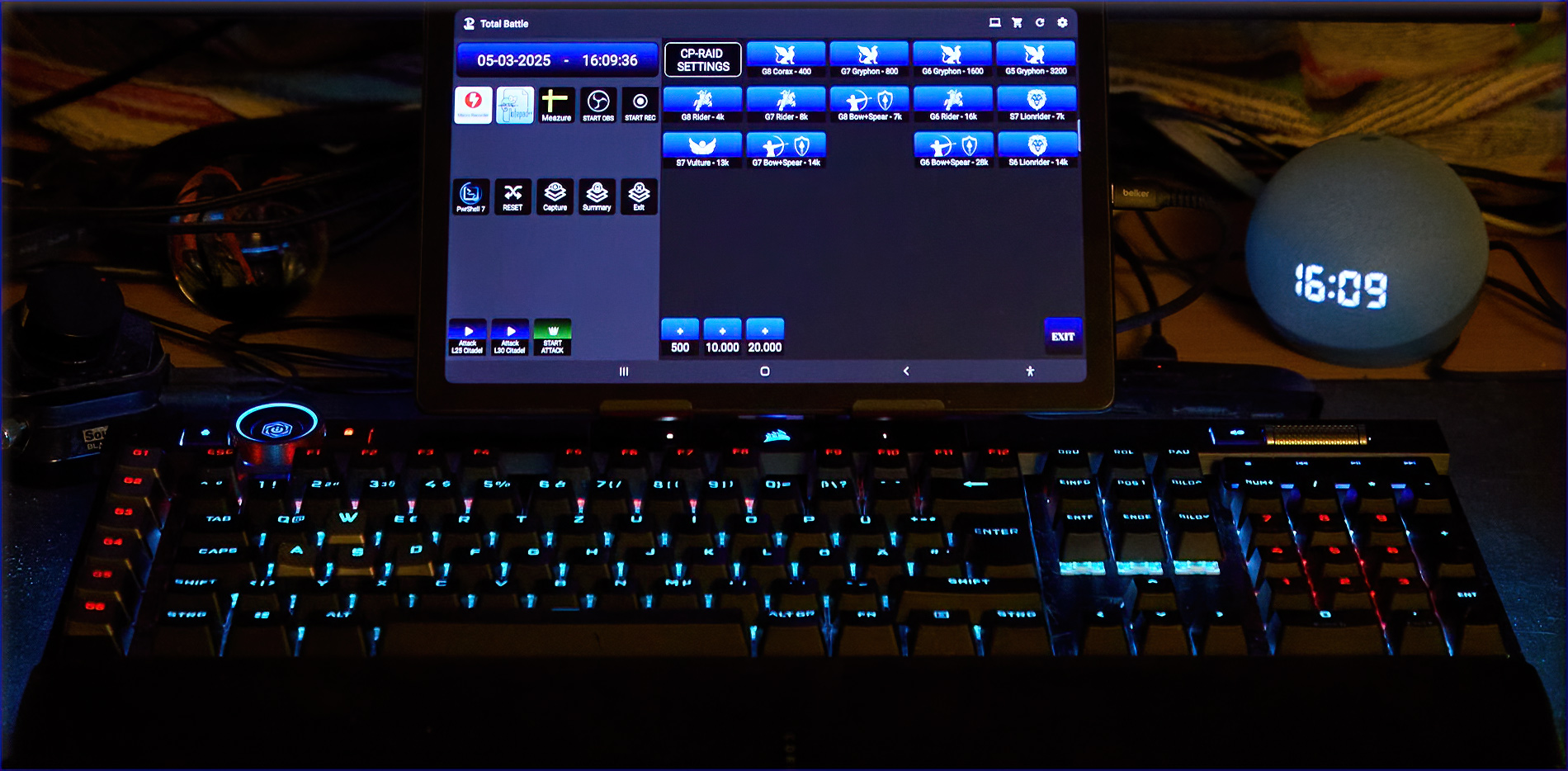 Für Total Battle habe ich ein Panel erstellt, welches mir die wichtigsten Funktionen auf einer Seite gewährt. Für unsere Spielerstatistik „Truhenzähler, Punktewertung“ startet ein Script für Powershell um die Truhen mit OCR abzuholen „Capture“ und eine Zusammenfassung „Summary“ am Ende des Tages zu erstellen. Weiterhin nutze ich den Macrorecorder um Zitadellen, so bequem wie möglich, anzugreifen. Das Meazure-Tool hilft, wenn der Schiebebalken auf eine neue y-Position gebracht werden muss. Die CP-Raid Settings sind praktisch, bei einem Eroberungspunktelauf. Die Einheiten der verschiedenen Truppen werden mit einem Knopfdruck übertragen. Verstärkung - Team auswählen und nun in das Feld für Raben mit der Maus klicken und den „Button“ G9 Corax 400 drücken, weiter zu den Gryphons und so weiter.