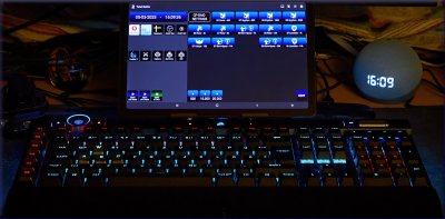 Mit einer Tablethalterung und etwas praktischem Know-How kann diese an die eigene Tastatur angebracht werden. Hier wurde der Lisen „Desktop Holder for Tablet“ an die Tastatur „Corsair K100 RGB“ angebracht. Die Halterung kann nach rechts und links geschwenkt und in der Neigung verstellt werden. Die Halterung kann komplett nach hinten und plan zur Tastatur gebracht werden.