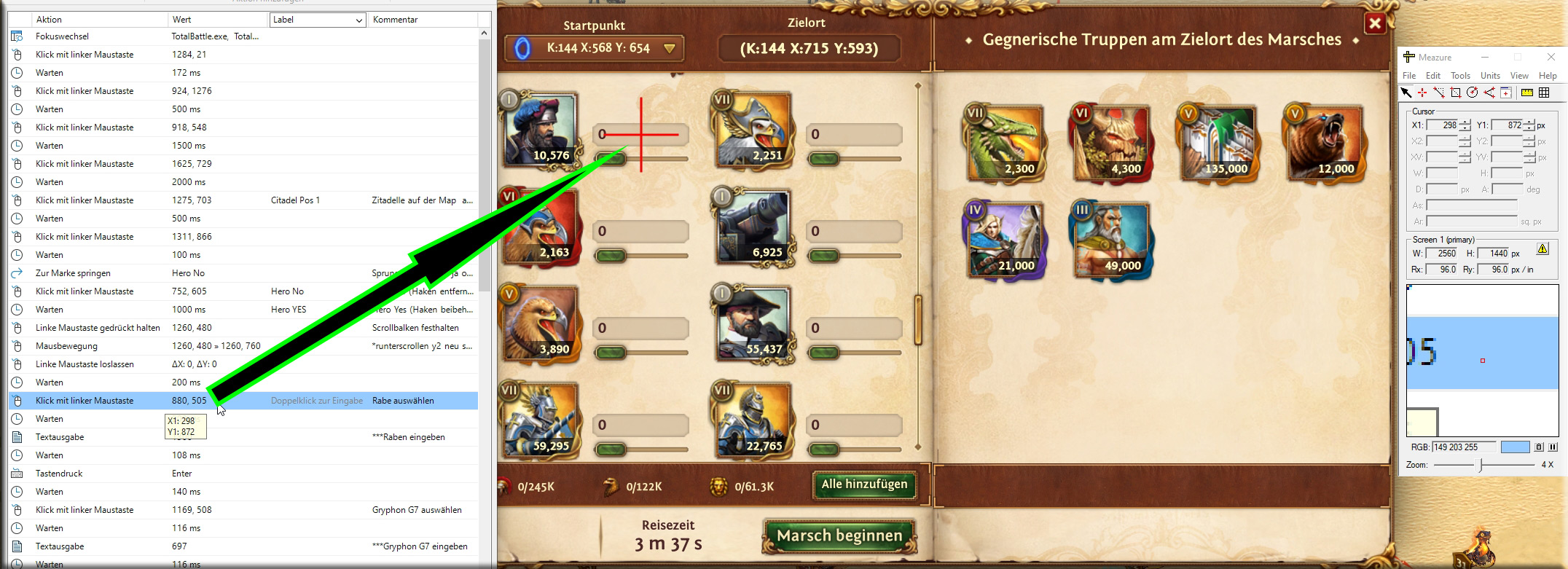 Die Beispiel Datei für den Macro-Recorder muss je nach Bildschirmgröße und eigenen Truppen in der Stadt angepasst werden. Die Datei vom Macrorecorder funktioniert auf einem Monitor in der Auflösung 2560 x 1440 Pixel mit gestartetem Total Battle PC Client (Fenstermodus maximiert, nicht Vollbildmodus). Das Macro-Script vom 25-10-2025 wurde nochmals modifiziert, Popup-Fenster eingeführt, eine Zweitwahl der Zitadelle eingeführt, falls die erste schon angelaufen wird und Infos, wenn die Scrollfunktion nicht passt, dass +17 Pixel bzw. -17 Pixel pro Bildreihe beim y-Wert angepasst werden können, um zu dem Bild der gewünschten Truppe zu gelangen. In Planung: OCR-Erkennung für die Scrollfunktion.