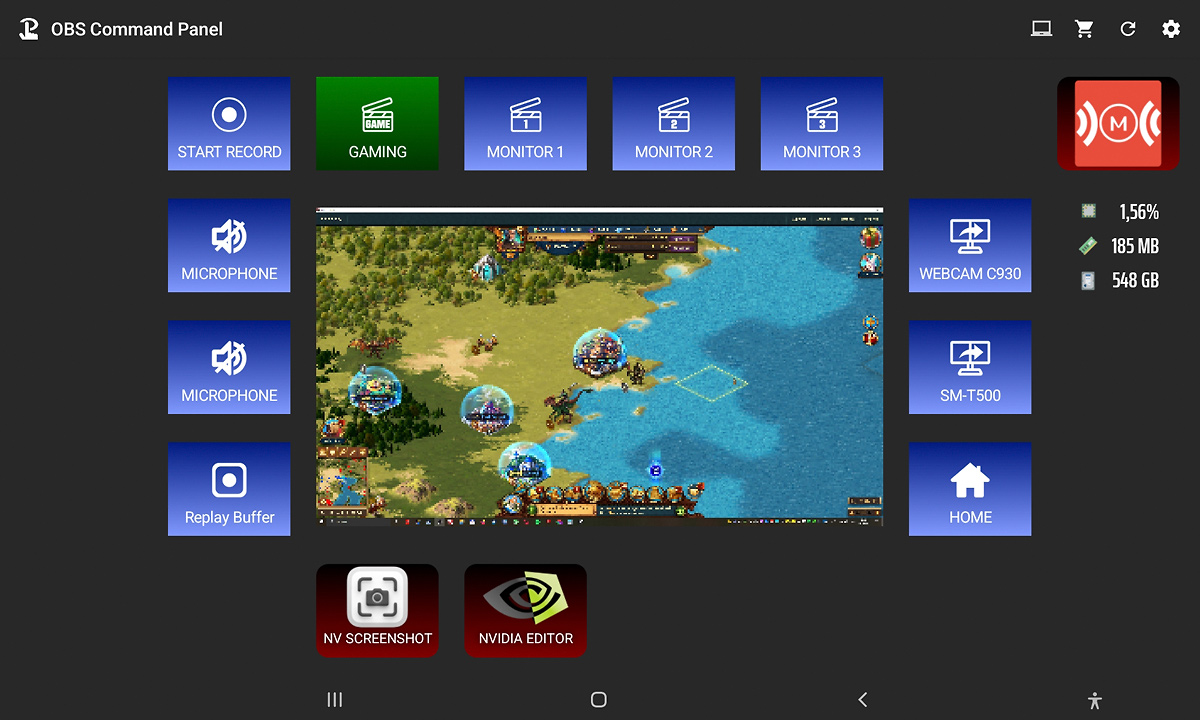 Mit einem Raster von 15 x 7 können 105 einfache Buttons erstellt werden. Mit Touch Portal gibt es keine Grenzen, die „Buttons“ können über mehrere Raster gedehnt werden, mit Bilder versehen und auch grafisch gibt es zahlreiche Möglichkeiten der Gestaltung. Wenn 105 Knöpfe immer noch zu wenig sind, der kann weitere Seiten erstellen. Es müssen nicht immer nur „Buttons“ sein, auch ein Live-Streaming mit 12fps ist möglich.