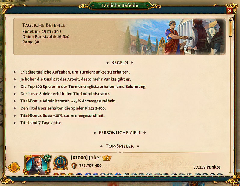 Um in die Rangliste zu gelangen solltest Du jede Menge tägliche Aufgaben erledigen. Gehe zu dem Menü Aufgaben im unteren Menübereich und dann weiter zu den Täglichen Aufgaben. In diesem Aufgabenfenster erscheinen zirka alle 2-3 Stunden neue Aufgaben. Diese täglichen Aufgaben können abgearbeitet, oder sofort eingesammelt werden. Bei den Aufgaben erhält man Gold, Eisen, Holz, Silber, Baupläne und weitere Gegenstände.