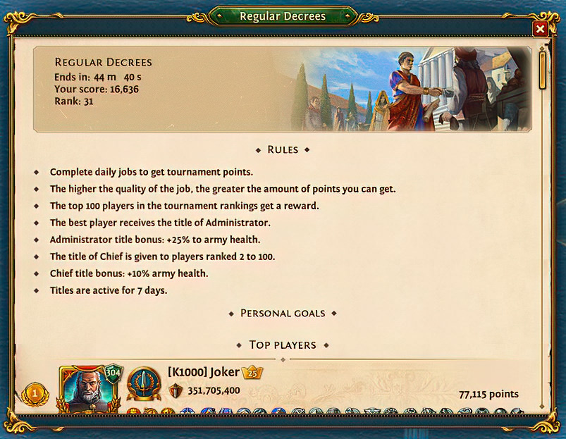 Für den ersten Platz erhält man den Titel: Administrator , +25% Gesundheit der Armee, Drachenmünzen und seltenes Fackelöl. Alle weiteren Plätze erhalten den Titel: Boss , +10% Gesundheit der Armee, Drachenmünzen und seltenes Fackelöl.